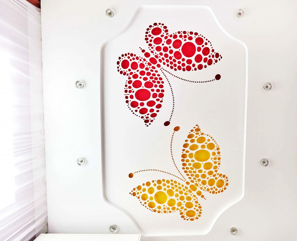 - Эксклюзивные варианты. В нашей компании можно купить натяжные потолки в Минске в виде резных конструкций, созданных из двух полотен.